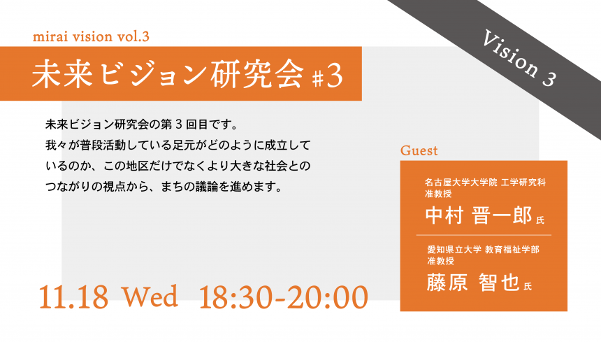 未来ビジョン研究会の第3回目は、アドバイザーである名古屋大学の中村晋一郎先生、愛知県立大学の藤原智也先生からの話題提供です。社会水文学、美術教育がご専門の先生方からの都心地区のまちづくりに対する示唆は必見です。我々が普段活動している足元がどのように成立しているのか、この地区だけでなくより大きな社会とのつながりの視点から、まちの議論を進めます。